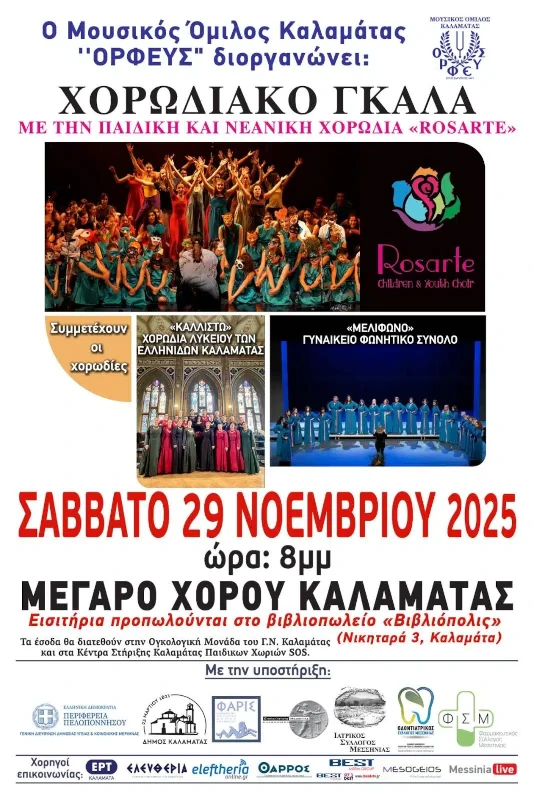 Μια μοναδική μουσική βραδιά γεμάτη αρμονία, συγκίνηση και προσφορά θα πραγματοποιηθεί το Σάββατο 29 Νοεμβρίου 2025 στο Μέγαρο Χορού Καλαμάτας. Ο Μουσικός Όμιλος Καλαμάτας «ΟΡΦΕΥΣ», σε συνεργασία με τον Ιατρικό, Οδοντιατρικό και Φαρμακευτικό Σύλλογο Μεσσηνίας, διοργανώνει το «Χορωδιακό GALA», μια εκδήλωση αφιερωμένη στην αλληλεγγύη και τον πολιτισμό.